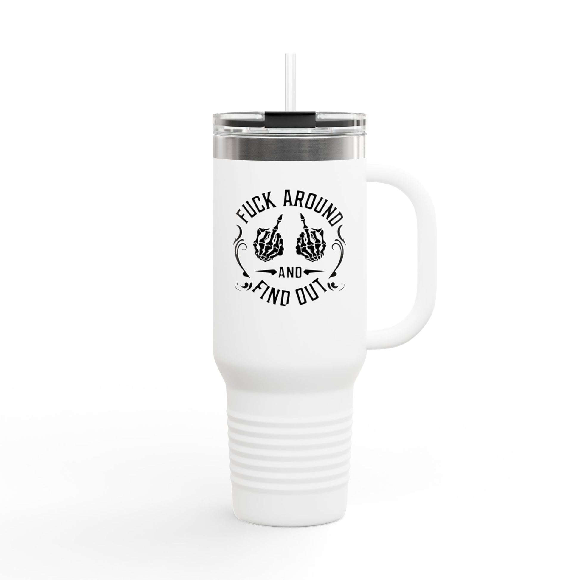 An edgy 40oz insulated travel mug featuring the phrase 'fuck around and find out'. Perfect for those who want to make a bold statement while keeping their drinks hot or cold for hours. Ideal for long trips, outdoor activities, and daily use. Relevant for those who enjoy humor and sarcasm in their everyday items. Perfect gift for birthdays, holidays, or just because.